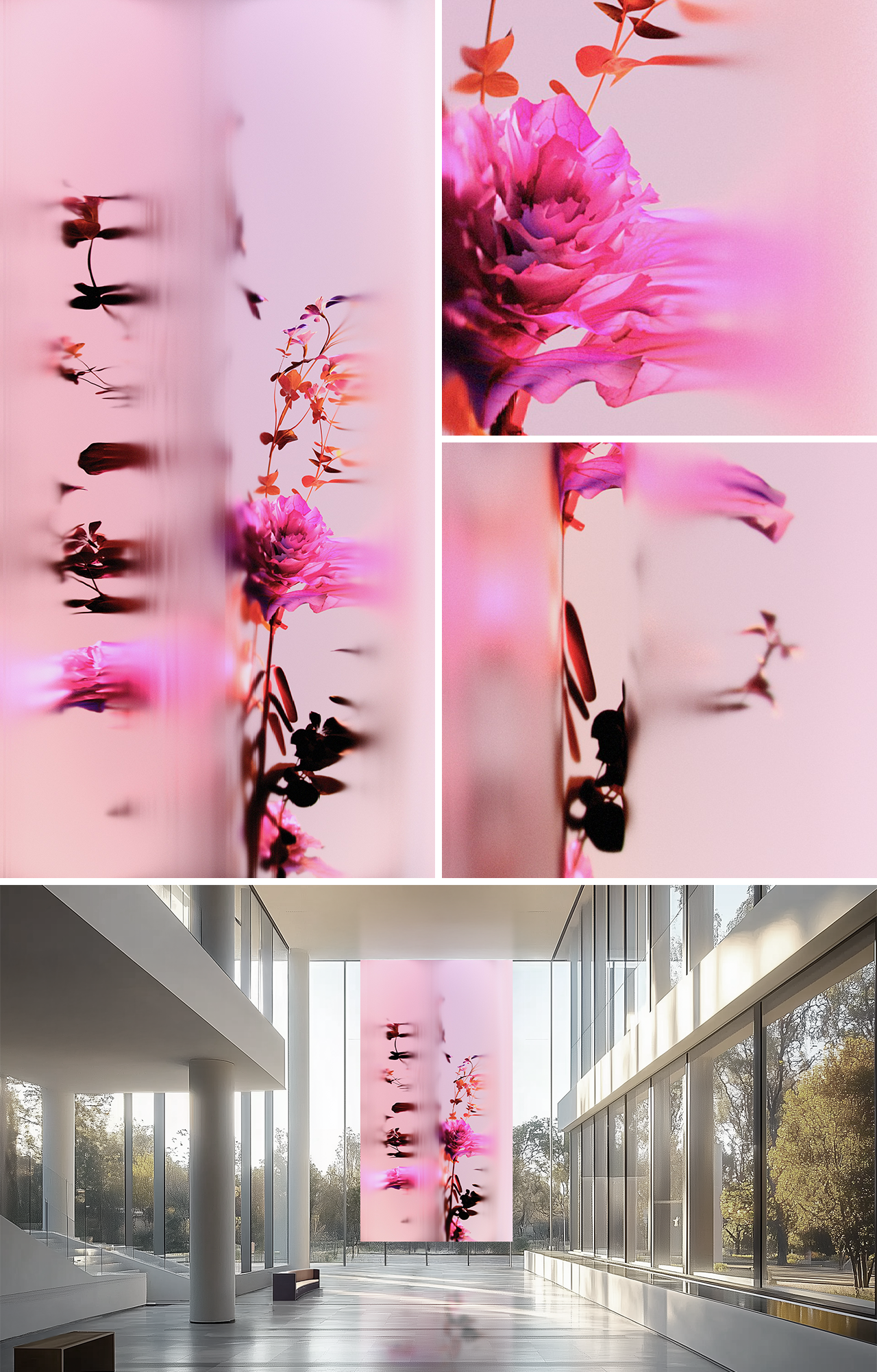 A static floral composition that, through delicate refractions, becomes alive and breathing. While the form itself remains unchanging, its interaction with light and distortion transforms it, inviting the viewer to reimagine the immutable beauty of nature. What is still becomes dynamic, flickering between reality and illusion. The piece is characterized by soft, soothing colors and hypnotic gradients that gently dissolve into one another, creating a surreal atmosphere. These tonal transitions evoke a dream-like state, as if the flower were suspended in time, caught in a moment of transformation that exists solely in the eye of the beholder. There is a subtle tension between the organic form and the artificial nature of its interpretation, suggesting a deeper contemplation of how nature might be seen through the lens of artificial intelligence. Through its fusion of natural beauty and digital reimagination, the work invites reflection on the shifting boundaries of reality, where the familiar becomes unfamiliar, and perception is as fluid as the gradients that wash across the composition.