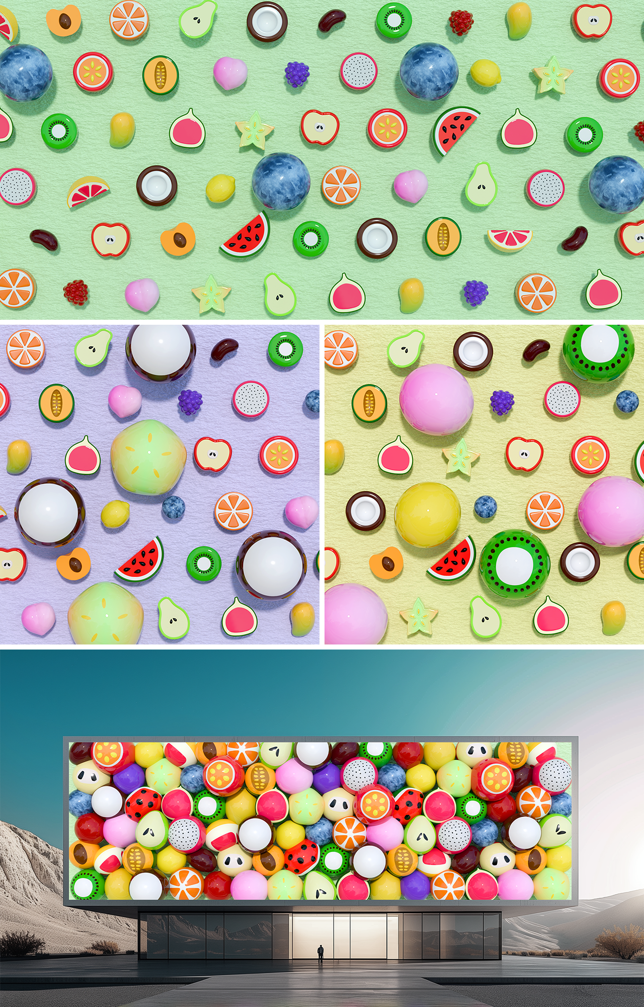 Fruits are familiar forms to everyone, yet they contain rich colors, textures, and sensory pleasures within. FruitBurst is a media art piece that reinterprets these everyday objects in a new way. Flat fruit magnets expand like balloons, filling the screen before returning to their original form in a continuous loop. Through this cycle of expansion and contraction, the fruits appear almost alive, creating a sense of movement that feels organic and dynamic. As the forms push outward toward the viewer, the audience encounters a vivid, immersive visual experience, as if the screen itself is advancing. The vibrant colors of the fruits inject vitality into the monotonous urban landscape, transforming the familiar into moments of playful imagination and subtle joy.