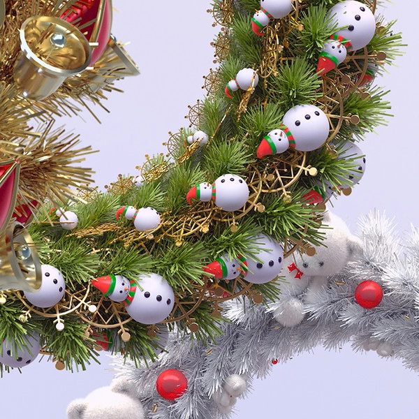 On a star-filled winter night, the square lights up brightly, centered around a Christmas tree. The buildings, blanketed in snow, and the warm lights envelop the space, creating a cozy atmosphere typical of the end of the year. Fairytale-like teddy bears, gift boxes, and decorative objects appearing throughout the square add to the festive excitement. The light decorations and starlight centered around the tree unite the space into a single stage, capturing the warm and happy emotions of the end of the year.